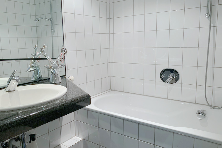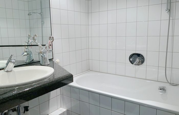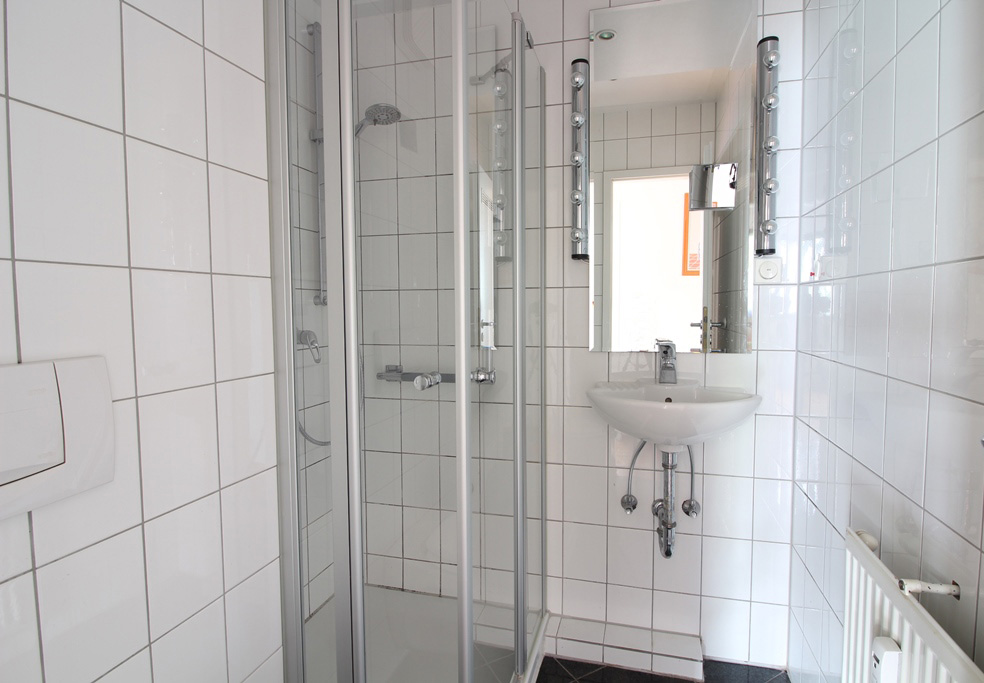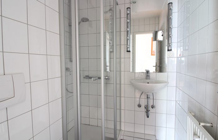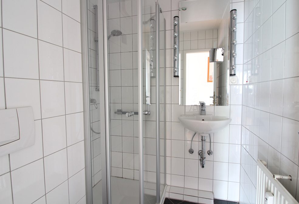 Die Warmwasserzubereitung im Bad erfolgt über einen Durchlauferhitzer.