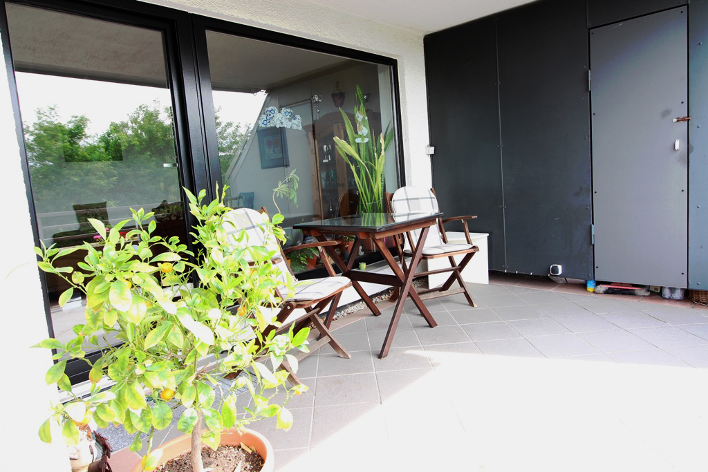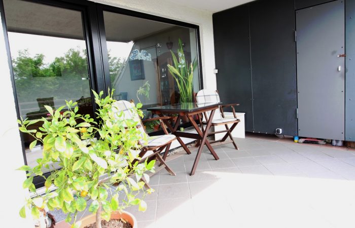 Die nach Süden ausgerichtete Terrasse lädt zum Entspannen ein. Ein integrierter Abstellschrank bietet praktischen Stauraum für kleine Gartenmöbel oder Polster.