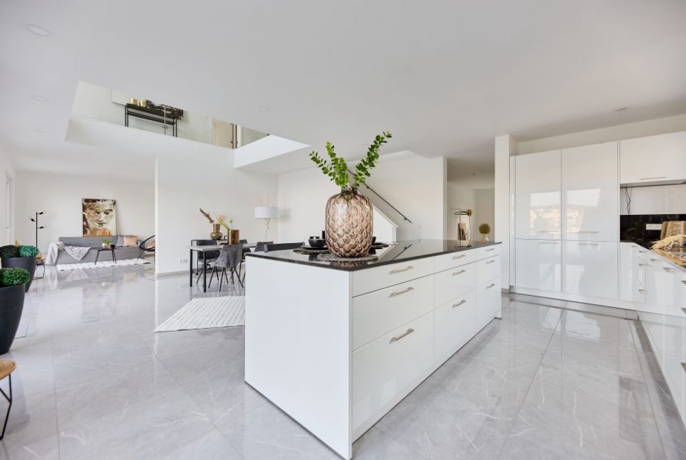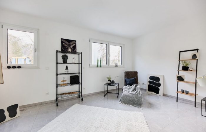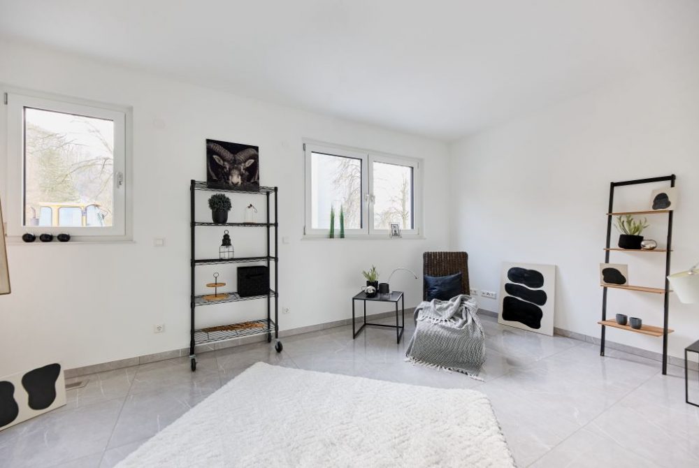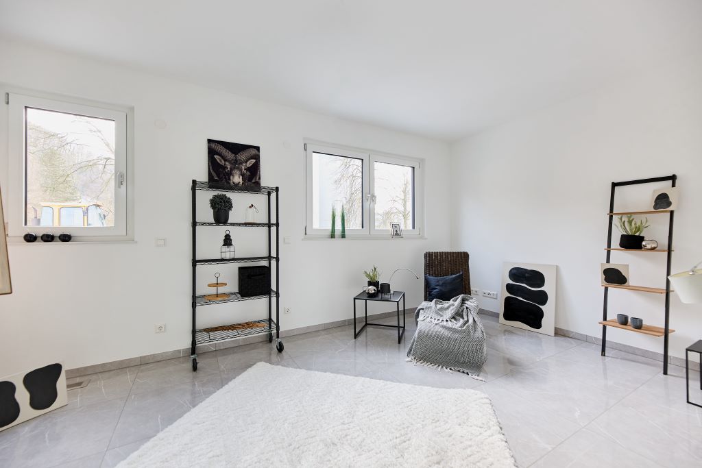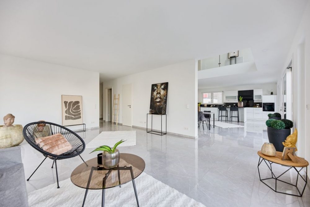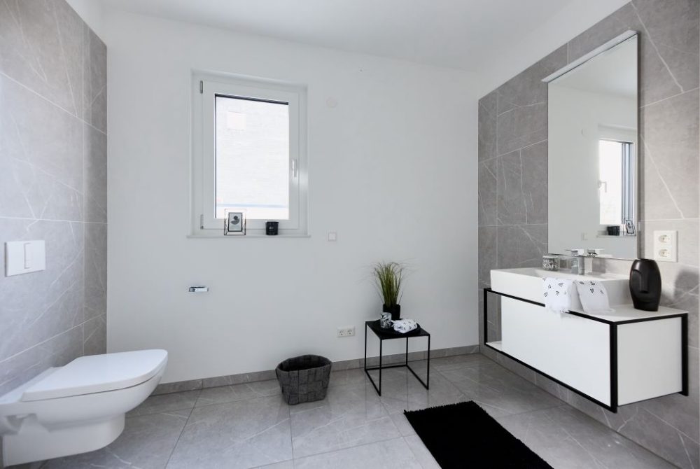 Im Erdgeschoss liegt durchgehend ein sehr heller Fliesenboden in großflächigem, quadratischem Format. Im Obergeschoss liegt ein heller Designboden. Die Bäder sind ebenfalls hell und großformatig gefliest und mit sehr geschmackvollen Badmöbeln komplett ausgestattet.