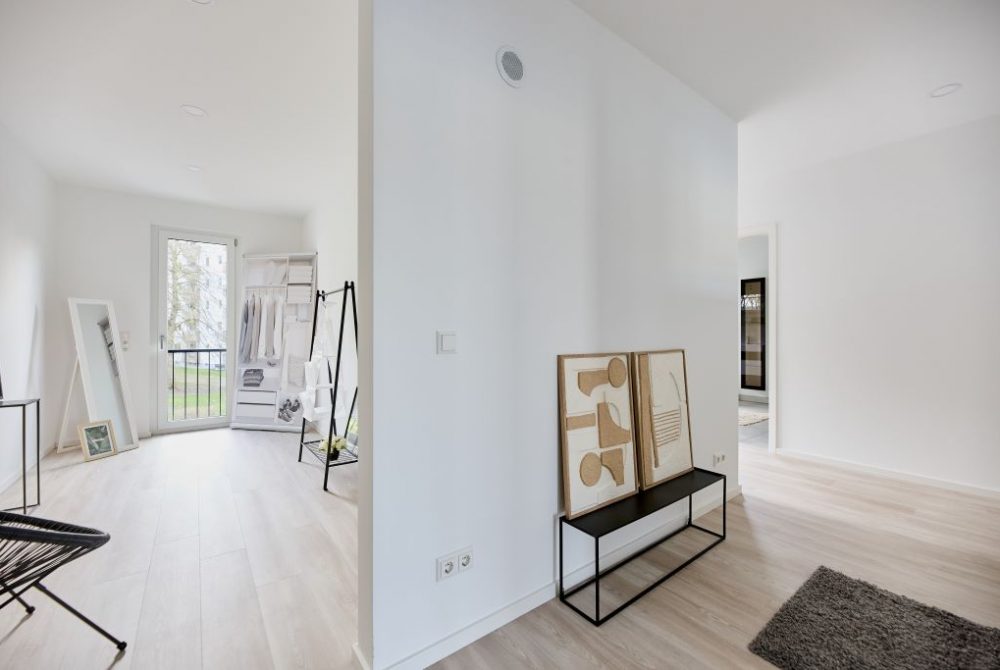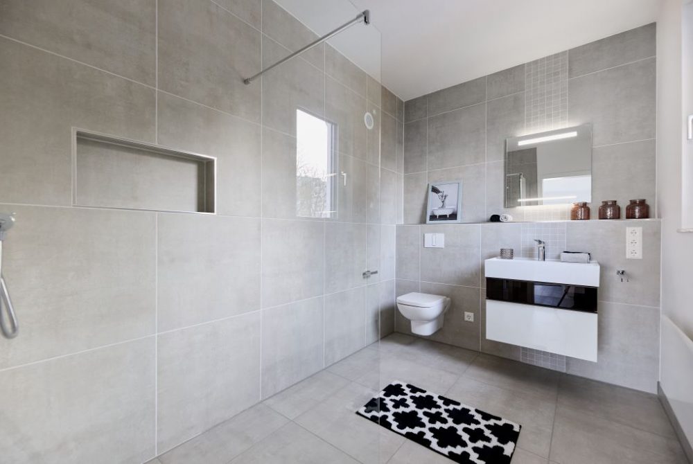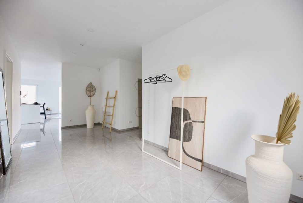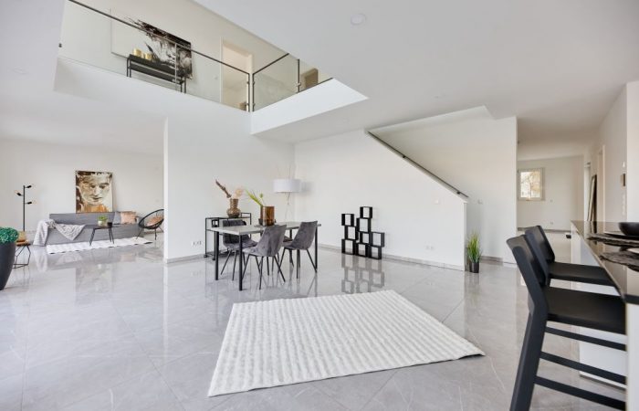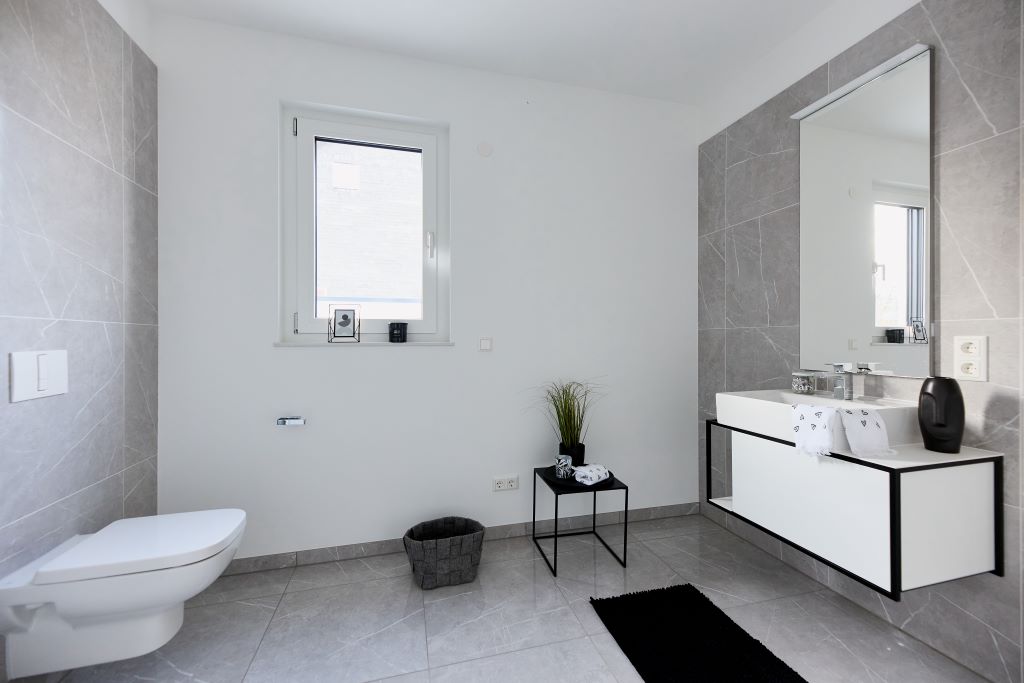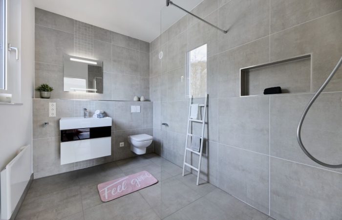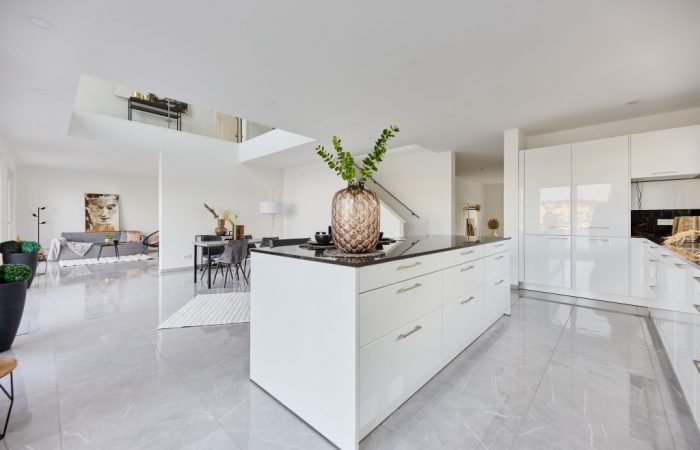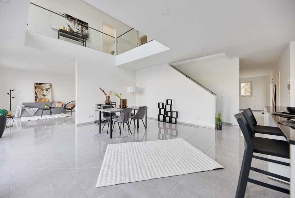 Im Erdgeschoss liegt durchgehend ein sehr heller Fliesenboden in großflächigem, quadratischem Format. Im Obergeschoss liegt ein heller Designboden. Die Bäder sind ebenfalls hell und großformatig gefliest und mit sehr geschmackvollen Badmöbeln komplett ausgestattet.