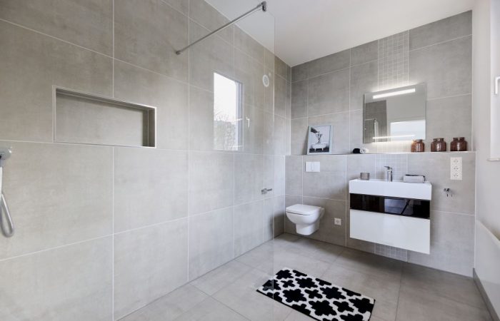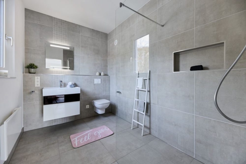 Große begehbare Dusche mit Glasabtrennung, Waschtisch, Toilette, Badmöbel, beleuchteter Spiegel.